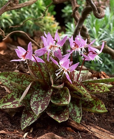 Кандык или эритрониум – редкое для наших садов луковичное растение. Цветки по форме напоминают тигровые лилии или цикламены. Садоводы любят их за неприхотливость, морозостойкость и долговечность.