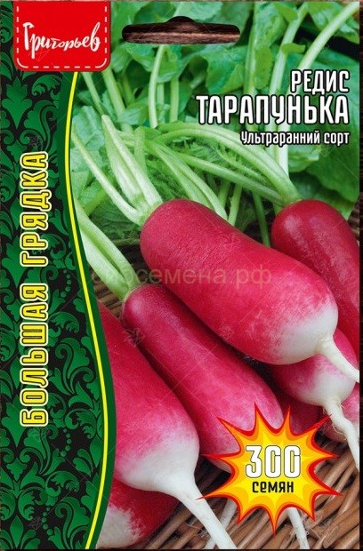 Редис Тарапунька - ультраранний (16-20 дней от всходов до технической спелости) сорт. Цвет корнеплода варьируется от розовато-красного до ярко-красного с белым кончиком. Форма — овально-цилиндрическая. Длина корнеплода достигает 8 см. Вес плода составляет 20-25 г. На одном участке земли за весенне-летний сезон можно получить до 4 урожаев этого корнеплода. Первый посев осуществляется сразу, как только сходит снег. Последующие - с интервалом не менее 2 недель. Последний посев производят в середине августа. Редис 18 дней характеризуется хорошей лежкостью. Для зимнего хранения подходят корнеплоды, выращенные с середины августа до конца сентября.