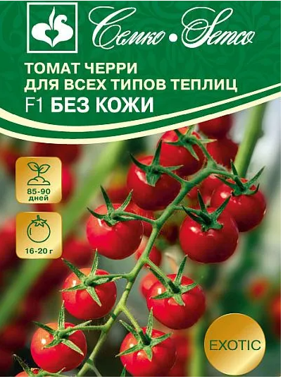 Томат Без Кожи F1 - ранний индетерминантный гибрид для выращивания во всех типах теплиц и в открытом грунте с подвязкой к опоре. От всходов до созревания 85-90 дней. Растение компактное со светлыми листьями и укороченными междоузлиями. Первое соцветие закладывается над 7-9 листом. Кисти простые и сложные, средней плотности. Плоды округлые, чрезвычайно блестящей яркой тёмно-красной окраски, двухкамерные, массой 16-20 г. Отличительная особенность этого гибрида томата – плоды имеют очень тонкую кожицу нежной текстуры, которая не ощущается при их употреблении. Как будто томаты без кожи. Мякоть сочная, с очень высоким содержанием сахаров. Вкус отличный, насыщенный. Дружносозревающий. Уникальное качество для употребления в свежем виде. Гибрид устойчив к вирусу томатной мозаики (ToMV), фузариозному увяданию (Fol 0-1) и нематодам (Ma, Mi, Mj). Рекомендован для теплиц всех типов и открытого грунта с подвязкой к опоре. Схема посадки 70х40 см. Урожайность 8-12 кг/м2.
