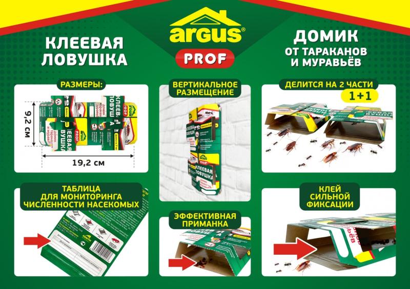 Клеевые ловушки ARGUS PROF просты в применении и могут быть установлены в любом месте, в том числе в местах хранения пищевых продуктов. Вскрытые ловушки сохраняют активность в течении трех месяцев. Способ применения: Аккуратно открыть ловушку и отделить бумагу, закрывающую клей. С помощью клапана для фиксации сомкните замок. Установите ловушку вблизи стен, узких проемах. Для достижения лучшего результата рекомендуется использовать несколько ловушек одновременно. Ежедневно осматривайте ловушки - для своевременной утилизации.