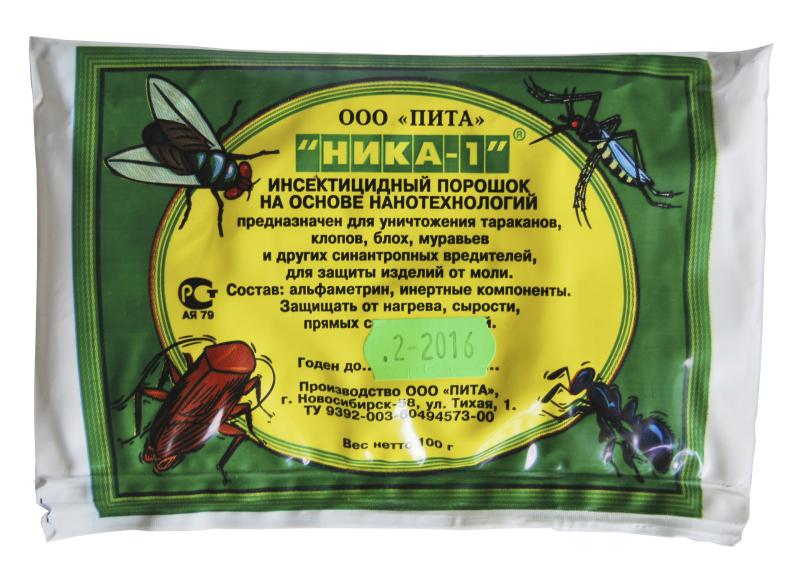 пакетик 100гр порошок Действующее вещество: альфациперметрин 0,15% Инсектицидное средство Ника-1 представляет собой порошок светло-серого цвета. Предназначено для уничтожения синантропных нелетающих насекомых (тараканов, постельных клопов, блох, муравьев), рекомендуется использовать в жилых помещениях, гостиницах, детских учреждениях, производственных и пищевых объектах, магазинах, складах, подвалах, подсобных помещениях. Расход средства 3-5гр на кв.м обрабатываемой поверхности. Препарат может оставаться на обработанных местах 2-3 недели, а в труднодоступных местах для человека до 2-х месяцев.